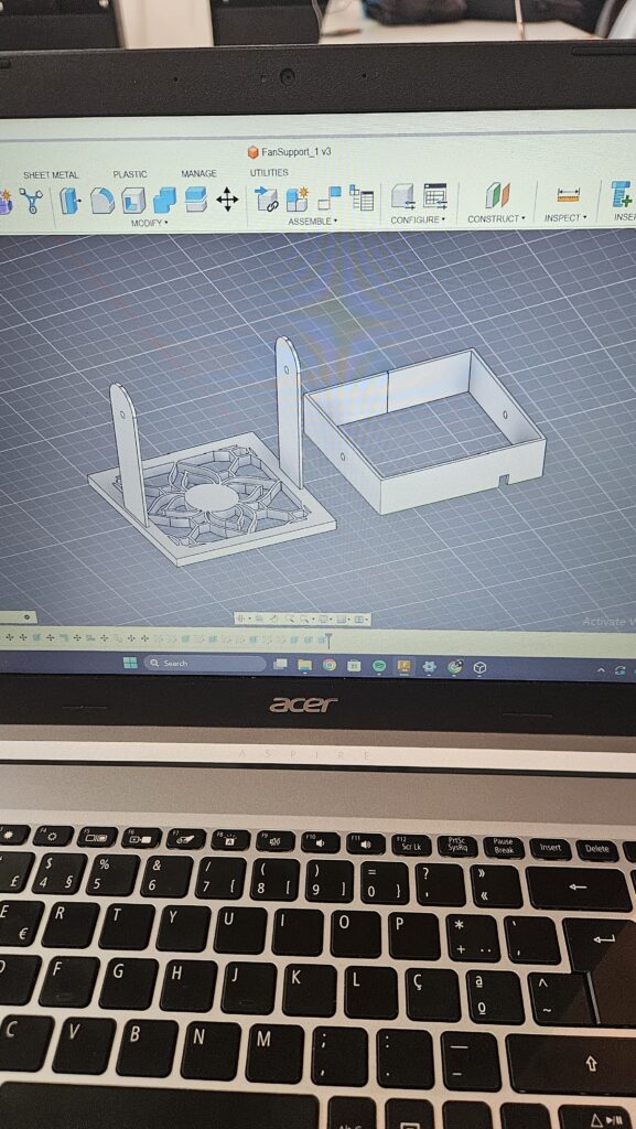 I also designed a stand for a mini USB fan. There was already a previous design, but I made a new one. What I tried to do was make it more stable and durable, since the previous one was more prone to wear. I think I succeeded. The previous one was more innovative but less durable; this one is more durable but less innovative. Everything has its pros and cons.